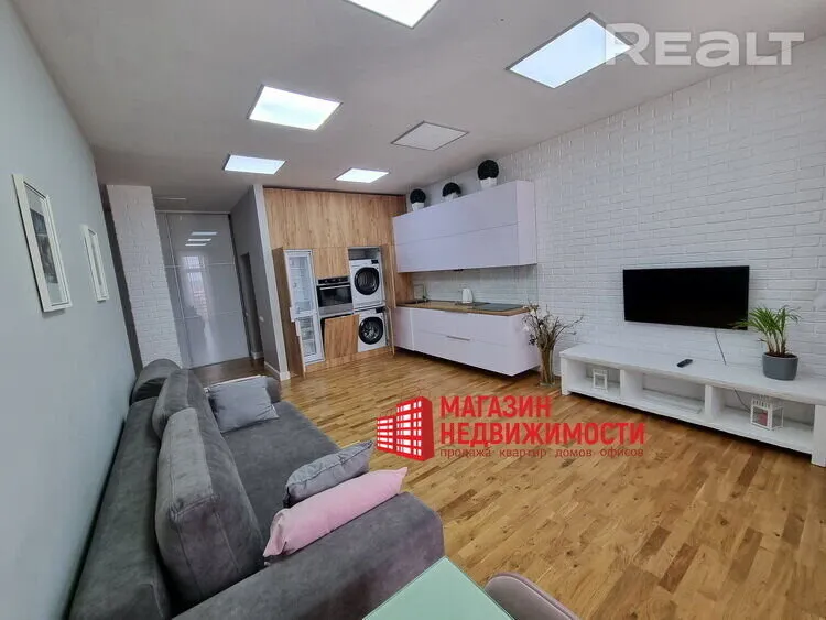 Кватэра – трохпакаёвая, але ў ёй дзве асобныя пакоі. Кухню сумясцілі з гасцінай зонай. Агульная плошча – 78,4 м2. Яна знаходзіцца на перадапошнім паверсе пяціпавярхоўкі. Санвузел – сумешчаны.
