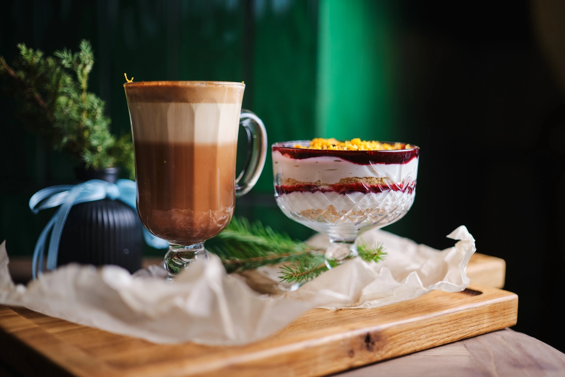 У кафэ можна будзе пакаштаваць каву Борджыа (напой рыхтуецца па італьянскай рэцэптуры), а таксама пігра-чызкейк з соусам на аснове яловых галінак і вішні.