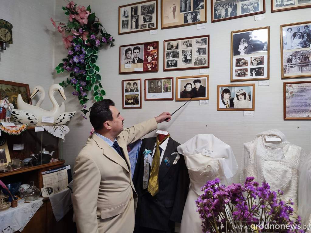 Вясельныя прадметы сімвалізуюць розныя эпохі: ёсць як надзіманыя лебедзі і вялізныя пярсцёнкі, так і сервант з крышталем ад шклозавода «Нёман».