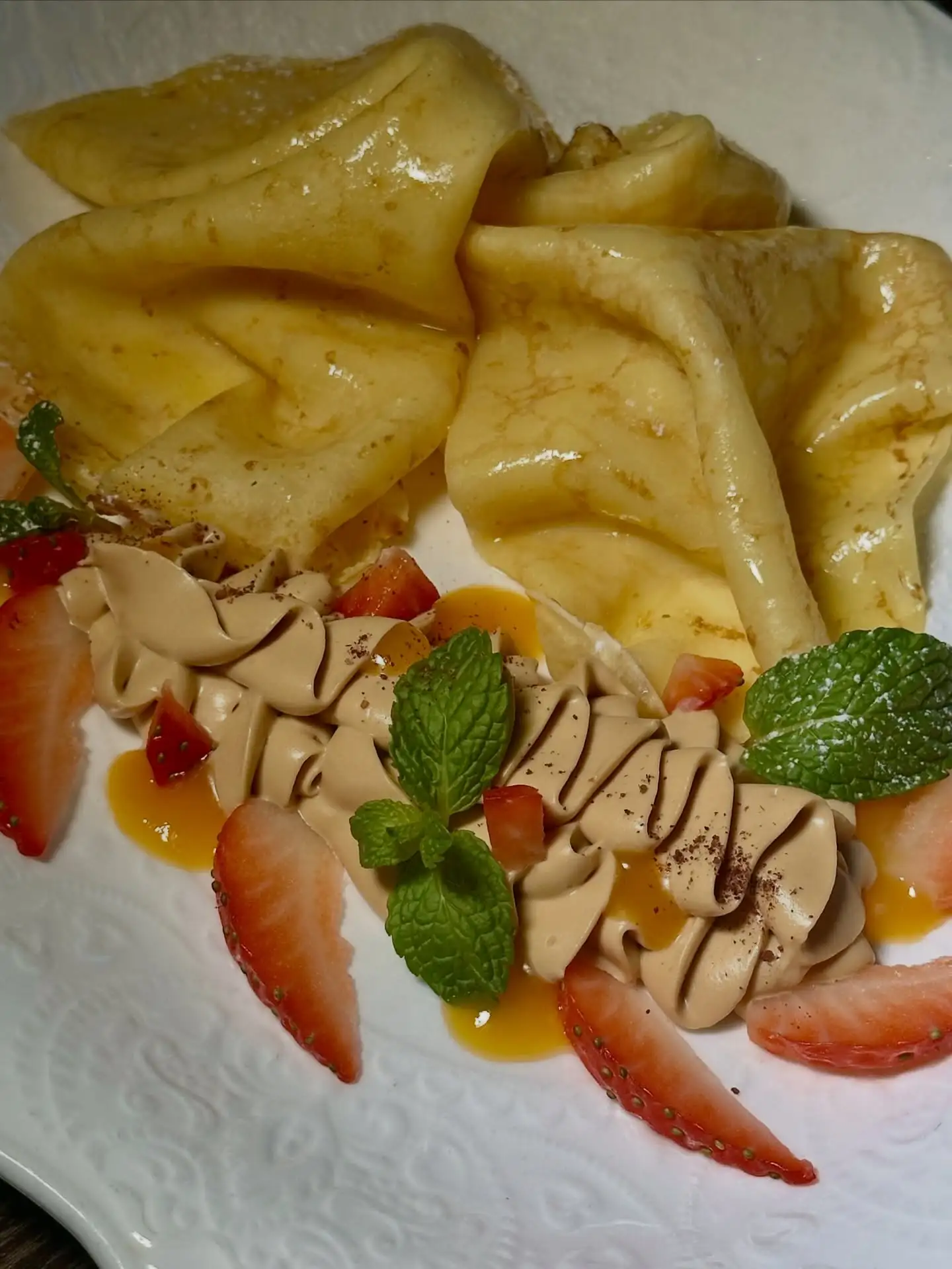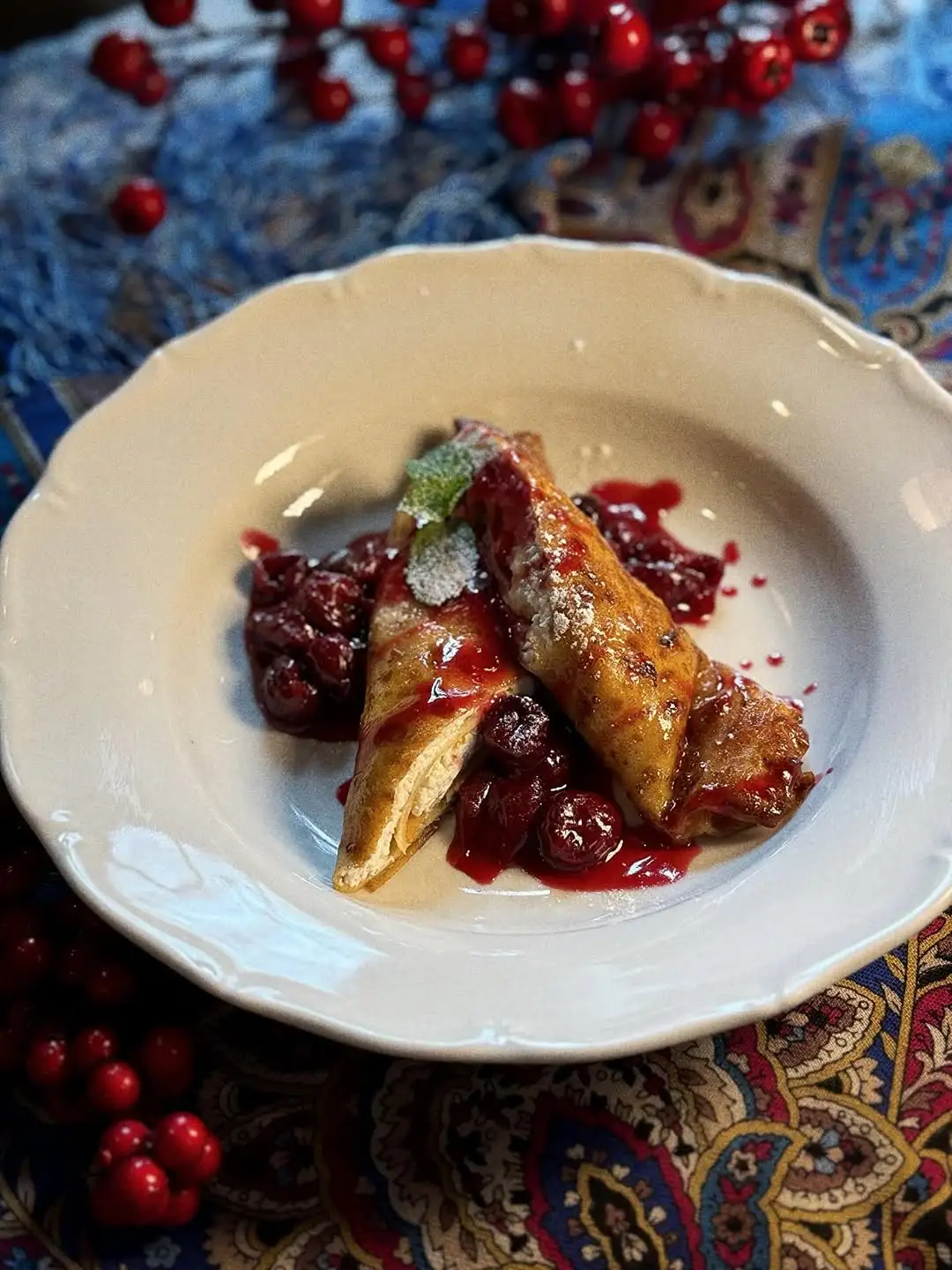 Ёсць і салодкія пазіцыі. Блін з вішняй у шакаладзе і каньяку (15 руб.), макавы блін з кляновым сіропам (12 руб.) і блін з тварожным сырам і мандарынам (12 руб.).
