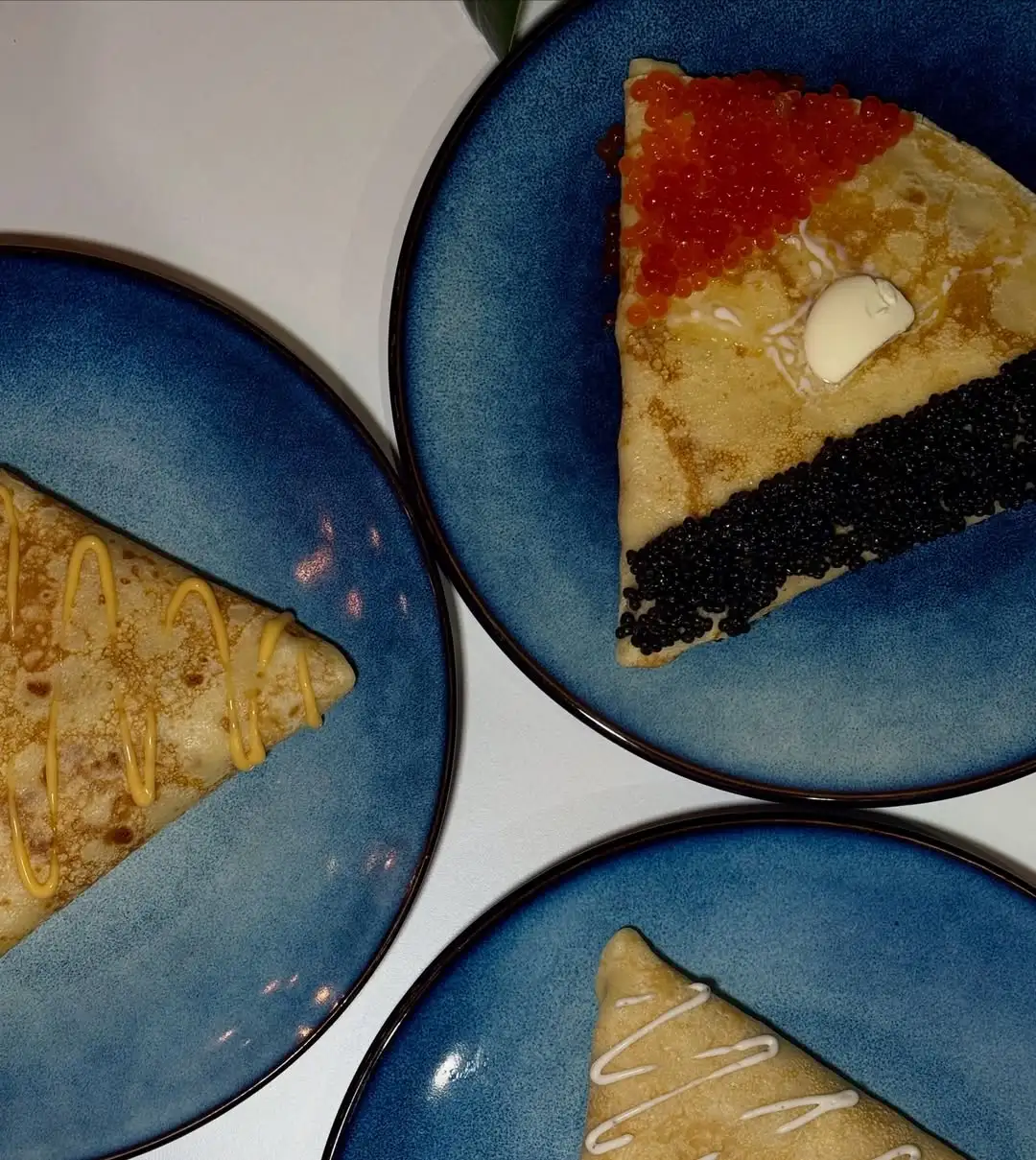 Рэстаран «Пешков» на Горкага, 27 прапануе блін з ірванай ялавічынай (11 руб.), з ласосем і кропам (12 руб.), са згушчонкам і бананам (8 руб.), а таксама з тварагом і вішняй (8 руб.).