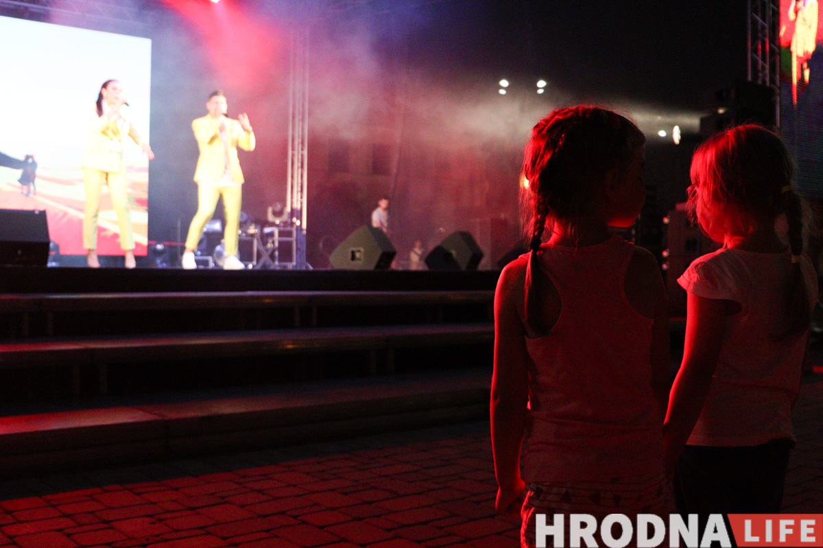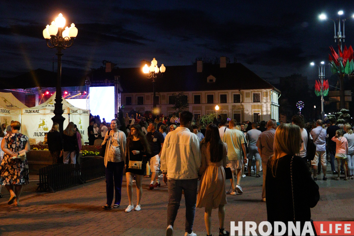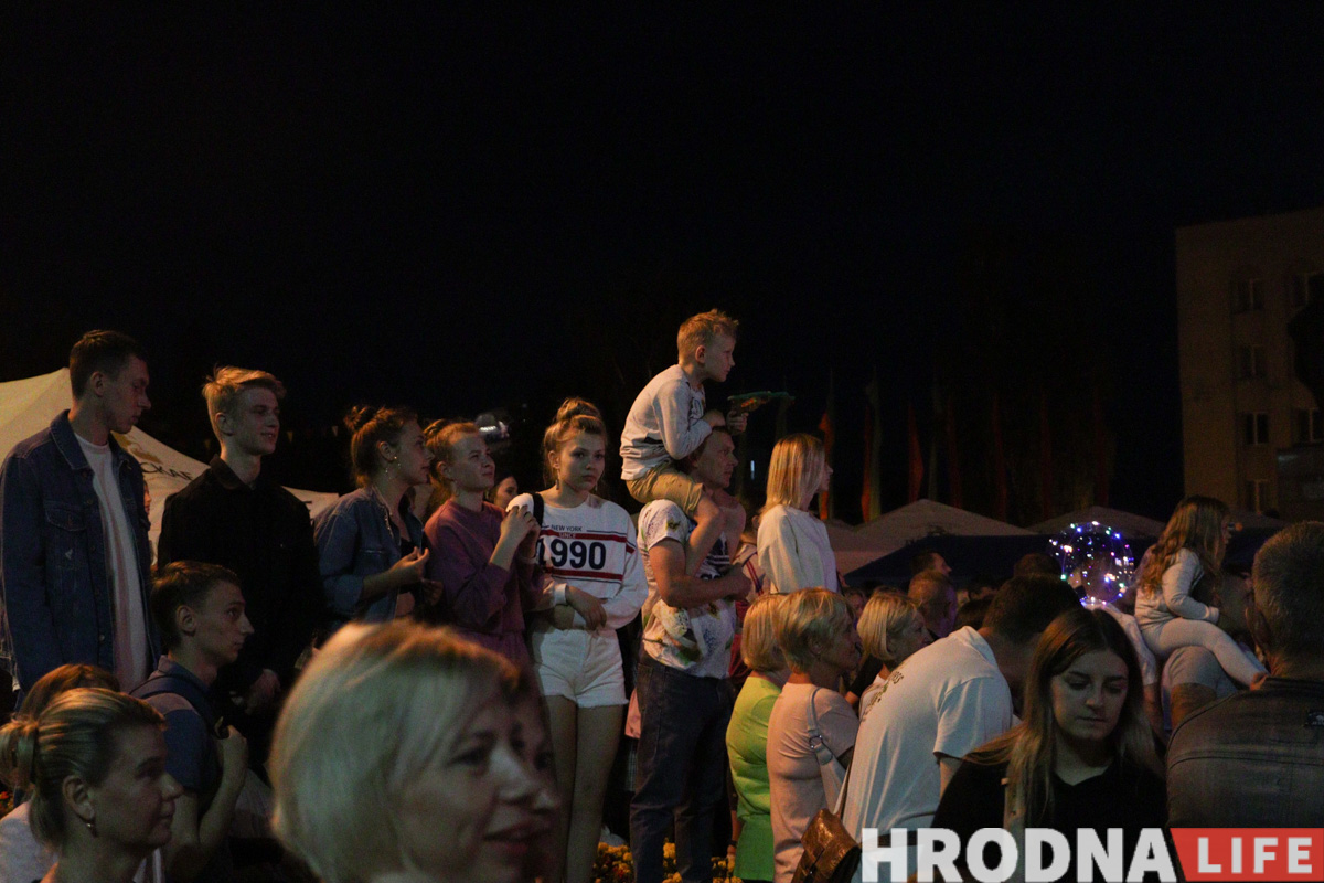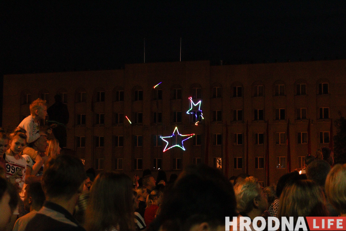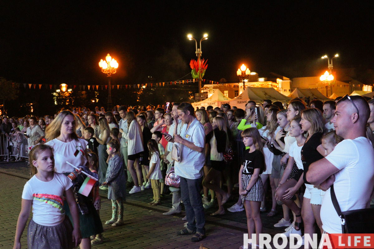Людзей ў раёне плошчы Леніна і ў глядацкай зоне стала заўважна больш. Пераважна гэта была моладзь, былі і сем’і з дзецьмі. На прапускных пунктах міліцыянтаў у святочных кашулях змяніў гродзенскі АМАП. Пасля салюта на галоўнай сцэне пачаўся выступ дуэта Тэа (Юрый Вашчук, прадстаўнік Беларусі на «Еўрабачанні”-2014) і Вольгі Рыжыкавай. У час канцэрта на гарвыканкам праецыявалі ўжо абстрактныя і геаметрычныя фігуры лазернага шоў.