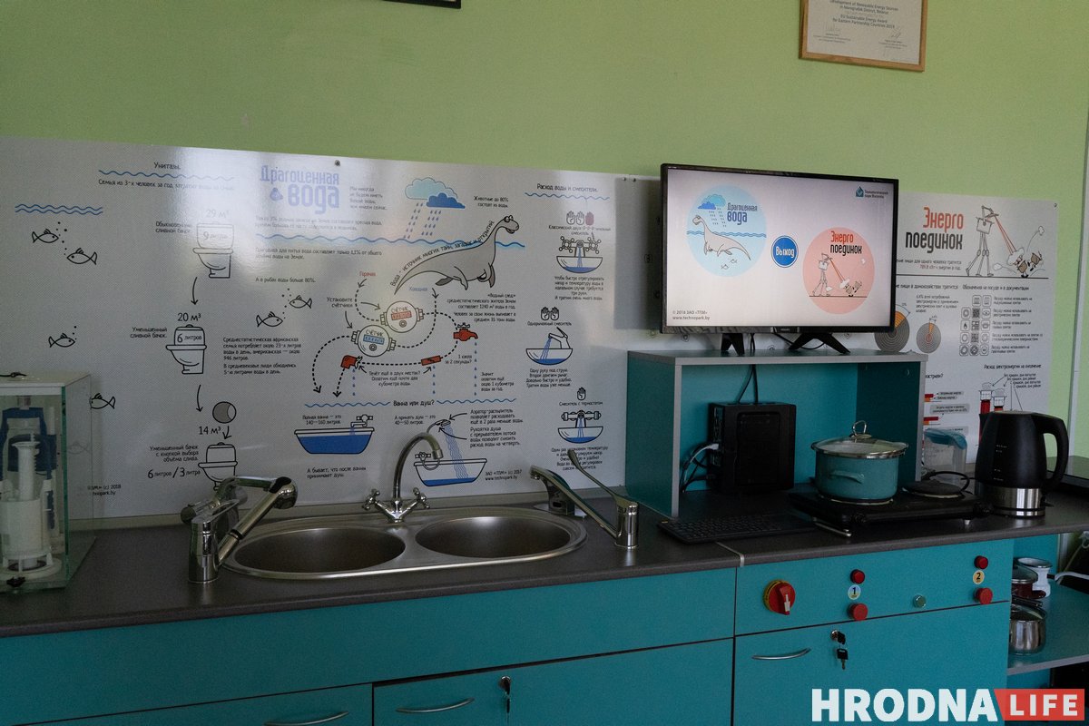 «Пры дапамозе праграмы і стэнда можна прадэманстраваць, як эканоміць электрычную энергію, выкарыстоўваючы розныя бытавыя прыборы», – распавядае Юрый Літавар. Тут ёсць электрычная пліта, рондалі, чайнік. З дапамогай іх праводзяцца вопыты, навучэнцы дзеляцца на каманды і правяраюць, хто хутчэй нагрэе аднолькавую колькасць вады ў розных прыборах, колькі часу на гэта спатрэбіцца, колькі выдаткуецца электраэнергіі, магутнасці і грошай. На гэтым стэндзе ёсць розныя краны для вады, каб прадэманстраваць, як эканоміць ваду.
