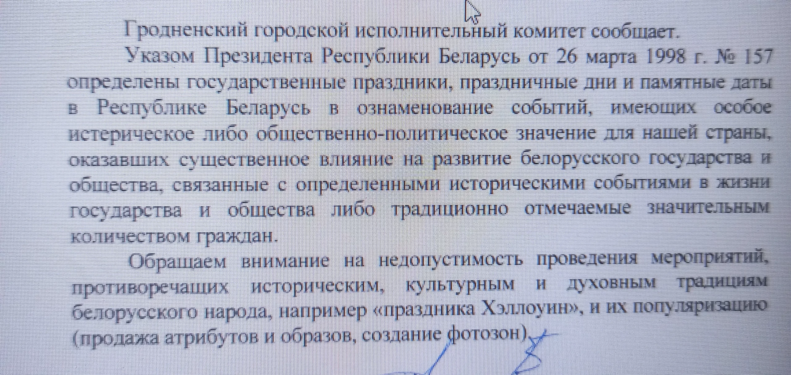 Акрамя Хэлоўіна ўлады забараняюць прадаваць тэматычную атрыбутыку і афармляць фотазоны. Электронны ліст разаслалі за тыдзень да свята. Па словах карыстальніцы, даручэнне падпісана намеснікам старшыні гарвыканкама.