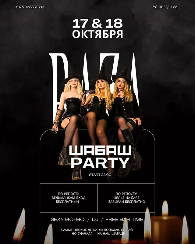 Так клуб «База» правёў «гарачае go-go шоу» і назваў яго «Шабаш Party». Вечарына прайшла ў выходныя 17 і 18 кастрычніка.