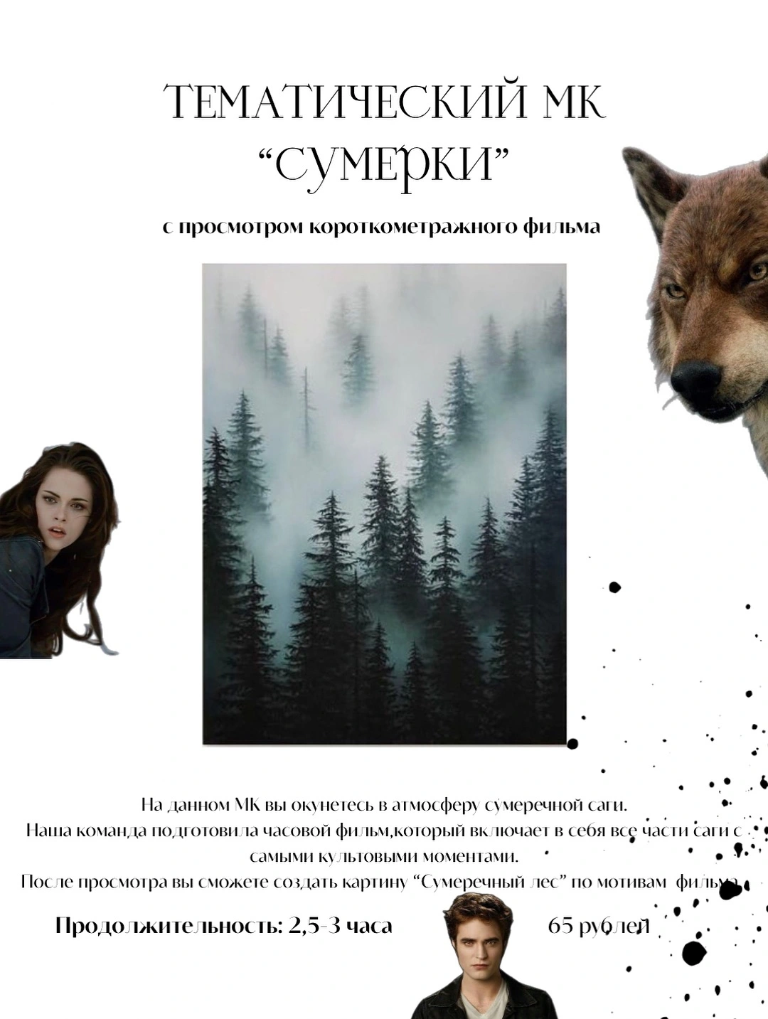 У арт-студыі «Час мастацтва» 24 кастрычніка правядуць тэматычны майстар-клас па фільме «Змярканне». Удзельнікі будуць маляваць восеньскі лес і глядзець сагу. Але такія ж майстар-класы праходзяць у студыі і ў іншую пару года.