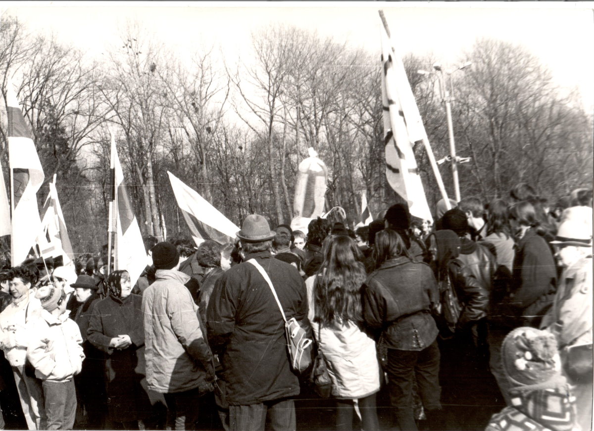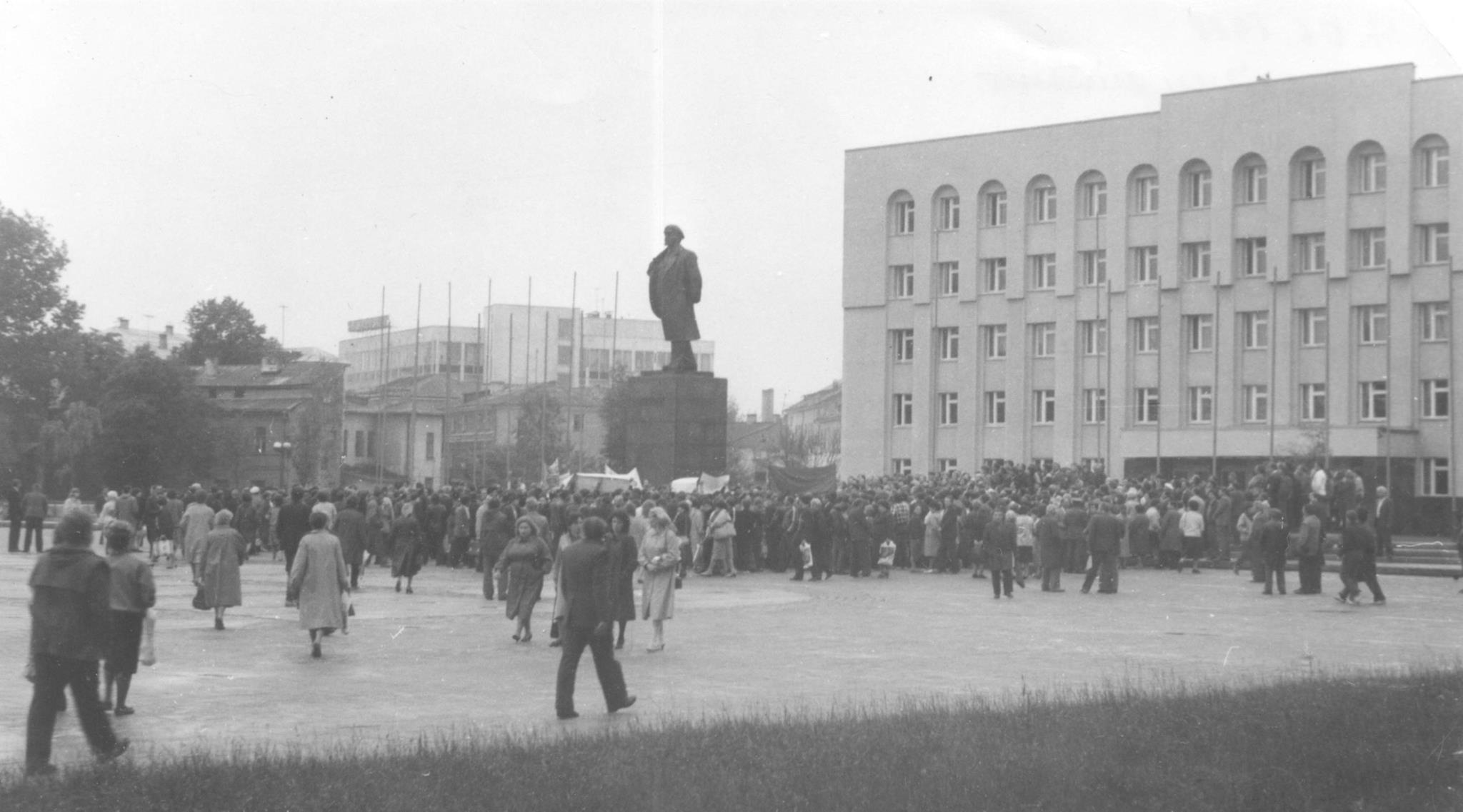 Демократические силы стали выходить в центр города еще за несколько месяцев до распада Советского союза. Все согласовывалось по закону: подавали заявку в горисполком и получали разрешение. Лозунгом одного из таких митингов было: “Камуністычная прыватызацыя рабуе наш народ”.
