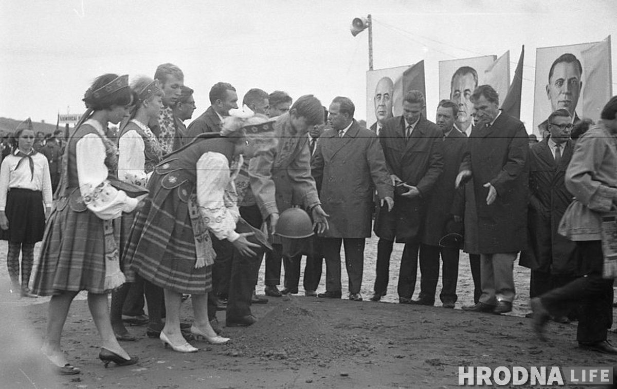Закладка капсулы ля Кургана Славы ў Гродне, 1969 год. Капсулу засыпаюць зямлёй, прывезенай з розных раёнаў Гродзеншчыны