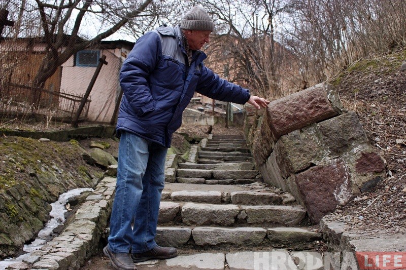 – Цяпер так кажуць, але гэта не так было. Можа дзе пару прыступак і ёсць, потым узялі, умацоўвалі. Але лесвіцу будавалі яшчэ да немцаў. Там наверсе, дзе Рыбны рынак быў, была майстэрня каменачэсная. Добрыя майстры былі, на ўвесь горад. У іх шмат заказаў было, яны рабілі.