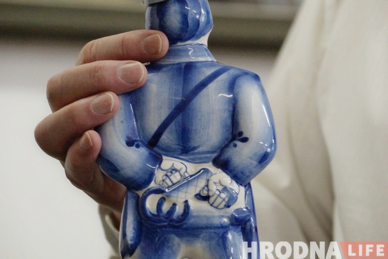 “Калекцыя пачалася вось з гэтага служакі”, –  Сяргей Каляда паказвае распісаную  пад гжэль ляльку. Не памятаю нават, адкуль дакладна прывёз гэты сувенір. Але мне спадабалася закладзеная ўяго ідэя. З аднаго боку – гэта вельмі дабрадушны і пазітыўны міліцыянер – кветачкі на кабуры. А за спіной – пісталет і кайданкі нагатове. Тобок, ён можа пры неабходнасці сілу выкарыстаць”.
