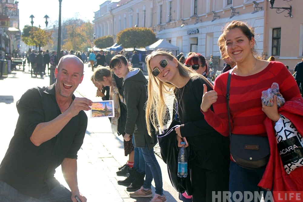 Не паспеў канадзец раскласці свае фатаграфіі на плітцы ў цэнтры Гродна, як вакол яго утварыўся круг з цікаўных людзей.