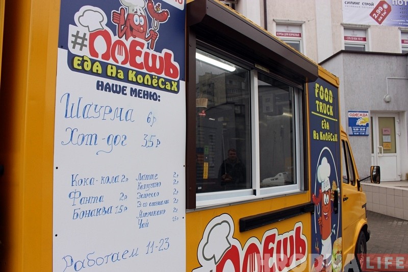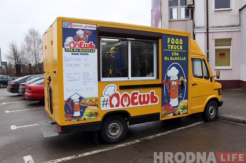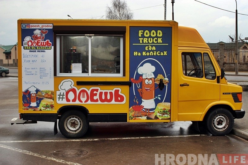 З пачатку сакавіка на вуліцах Гродна можна заўважыць незвычайны фургон – такія на захадзе называюць фуд-тракамі. “Кафэ на колах” вырашылі запусціць два сябра Дзмітрый і Максім. Сёння ў іх фургоне можна купіць хот-догі, кебабы і гарачыя напоі.