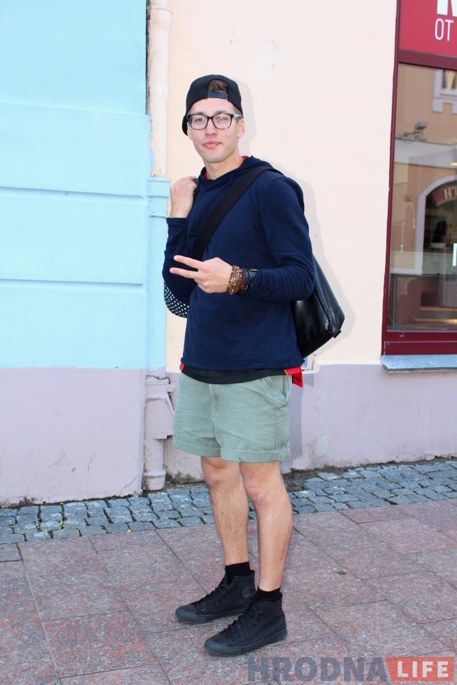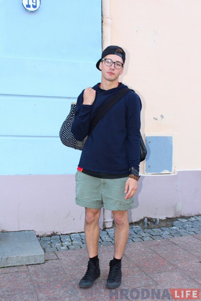 Адзенне набываю ў Польшчы, для мяне галоўнае зручнасць. Любімыя маркі – Pull and Bear, Reserved, H&M. Сёння на мне вялікія і зручныя шорты, іх мне хтосьці аддаў; кофта H&M; майку мне падарыла дзяўчына; фенечкі ад сябра, дзяўчыны і з месцаў адпачынку.