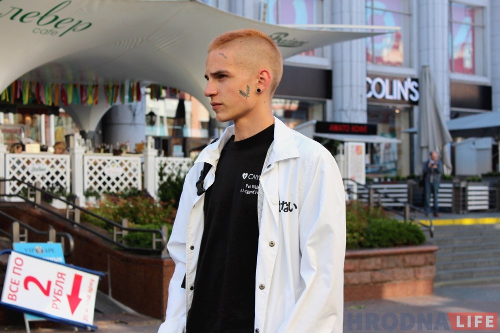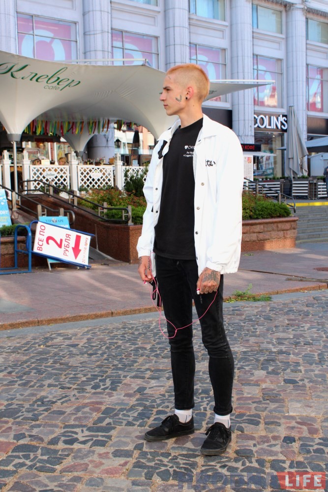Татуіроўкі я раблю і нашу. Мне было сумна, сядзеў дома і мне мой сябар паказаў, што можна біць шпрыцам. Любімыя маркі – Zara, Adidas, COMME DES GARÇONS PLAY. Сёння на мне кеды Vans, шкарпэткі Nike, джынсы Thrasher, бомбер Zara.