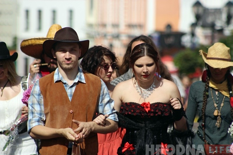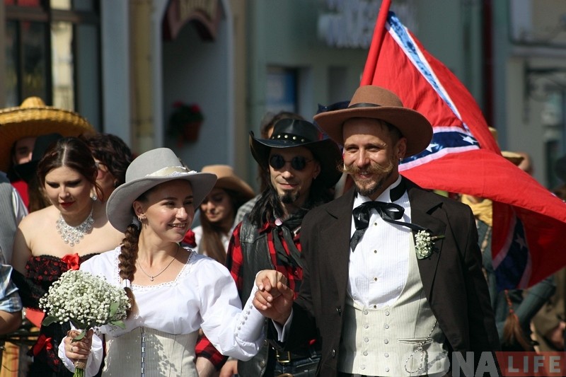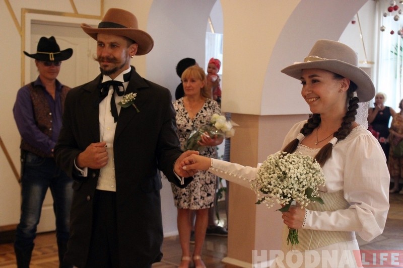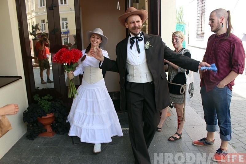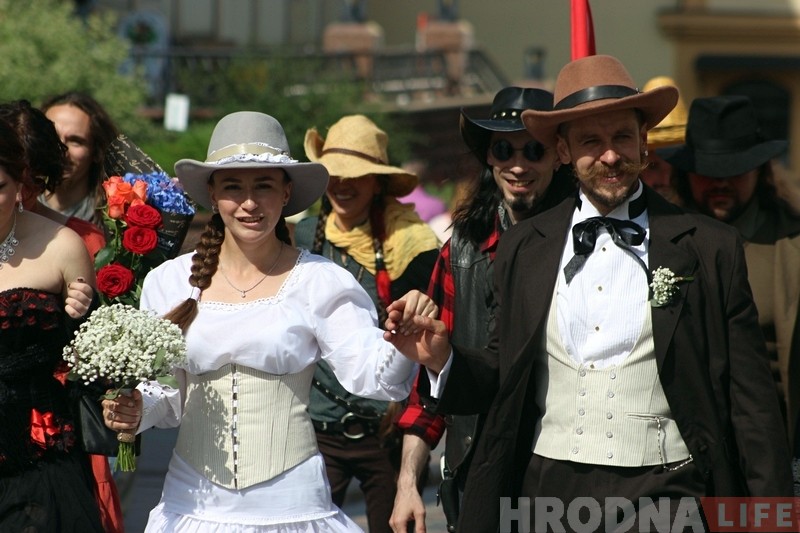 “Нядаўна ў нашых сяброў было вяселле ў стылі постапакалiпсiсу, стымпанку і мы вырашылі працягнуць традыцыю – сваё вяселле зладзілі ў стылі Дзікага Захаду, – распавядаюць маладыя. – У нас не рэканструкцыя, а стылізацыя, так што госцi апраналіся як маглі. У многіх касцюмы атрымаліся вельмі цікавыя.