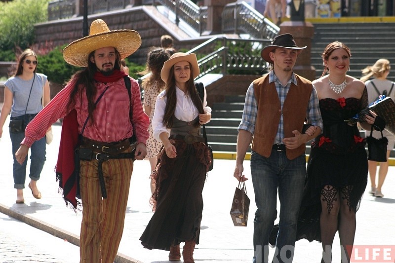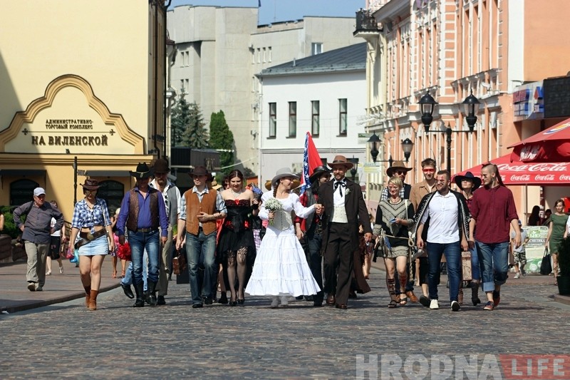 Маладая пара – аніматары, без якіх не праходзіць ніводнае свята ў горадзе. Госці на іх вяселле таксама прыйшлі ў касцюмах эпохі Дзікага Захаду. Госці – работнікі культуры, аніматары, сваякі і сябры.