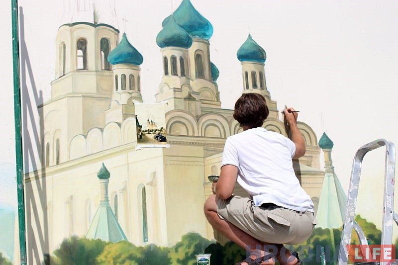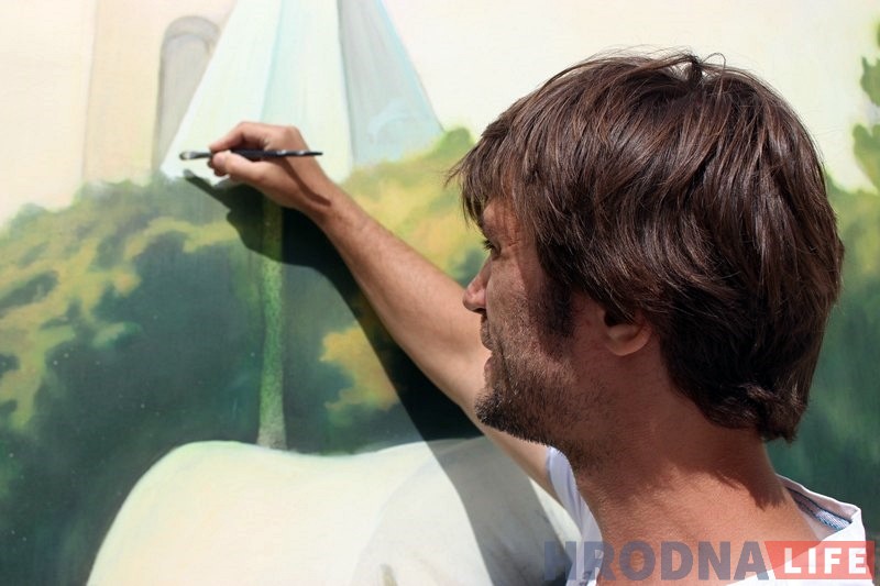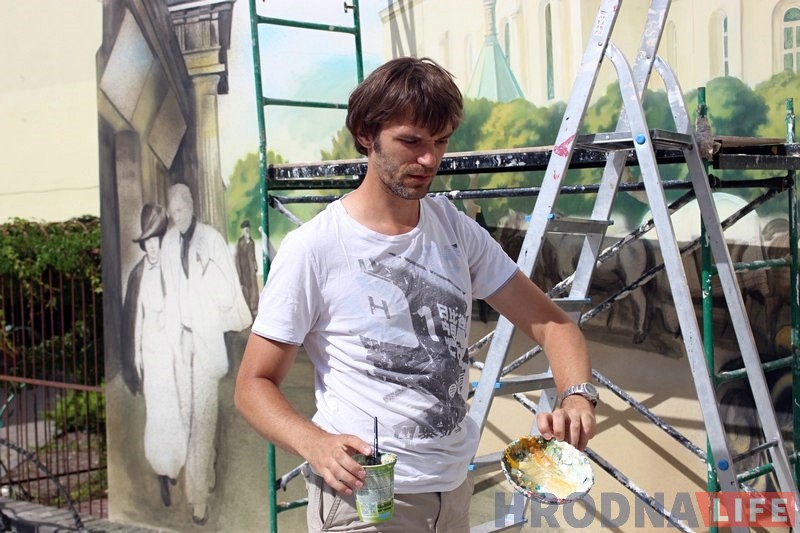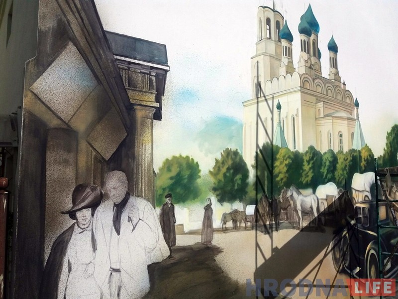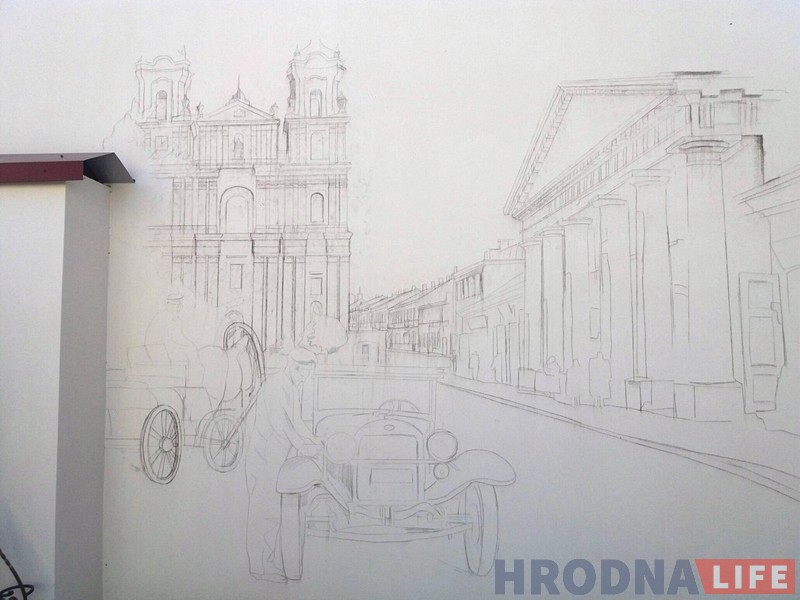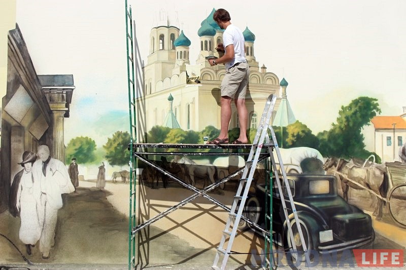 “Са мной звязаліся прадстаўнікі ABC і прапанавалі размаляваць сцены, я пагадзіўся, – кажа Аляксей. – Вырашылі зрабіць роспіс прысвечаны Гродна пачатку XX стагоддзя. За аснову ўзяў старыя здымкі цэнтра горада. Мы хочам паказаць, што страцілі за перыяд войнаў і разбурэнняў. Наша мэта – перадаць атмасферу старога горада”.