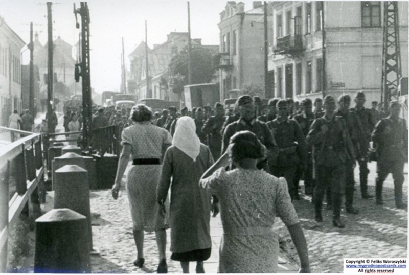 «Бачыла часта як салдаты маршыравалі i адпачывалі. Не пашанцавала яўрэйскаму насельніцтву горада, немцы адразу сталі да іх дрэнна ставіцца — здзекаваліся, хадзіць па тратуару забаранілі, было загадана насіць апазнавальную жоўтую зорку. Амаль адразу яўрэям сталі рыхтаваць 2 гета. (Антонава і Траецкая). Памятаю, што мы з адной нашай знаёмай сям'і ў гета пераносілі з дзяўчынкамі ў паліто ежу, тады яшчэ не было варот. На маіх вачах на Тэльмана адзін немец біў палкай маладую яўрэйскую дзяўчыну. За што ён з ёй так груба абышоўся, я нават і не ведаю, але з гараджан ніхто не мог сказаць і слова — усе баяліся. Страшна было, але людзі неяк працягвалі жыць».