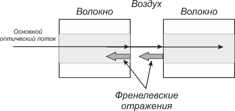 Обратные отражения в волоконно-оптическом тракте приводят к возникновению потока оптической энергии, который распространяется в противоположном направлении от того основного потока, который генерируется излучателем оптического передатчика (светодиодом, суперлюминесцентным диодом или полупроводниковым лазером). Создается каждой точкой волоконно-оптического тракта. Если внутри световода обратные отражения возникают из-за эффекта рэлеевского рассеяния, то оптический разъем вносит свой вклад за счет наличия френелевского отражения. Его суть заключается в том, что любая точка контакта оптически прозрачных материалов с различным показателем преломления начинает вести себя как полупрозрачное зеркало и отражает часть падающего на него светового потока в обратном направлении.