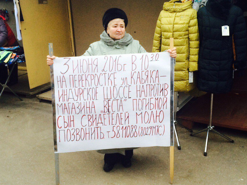 Читатели Автогродно сообщают, что в разных местах города встречают женщину с плакатом. Женщина выходит к людям с просьбой о помощи, она ищет свидетелей тяжелой аварии, в которой погиб ее сын.