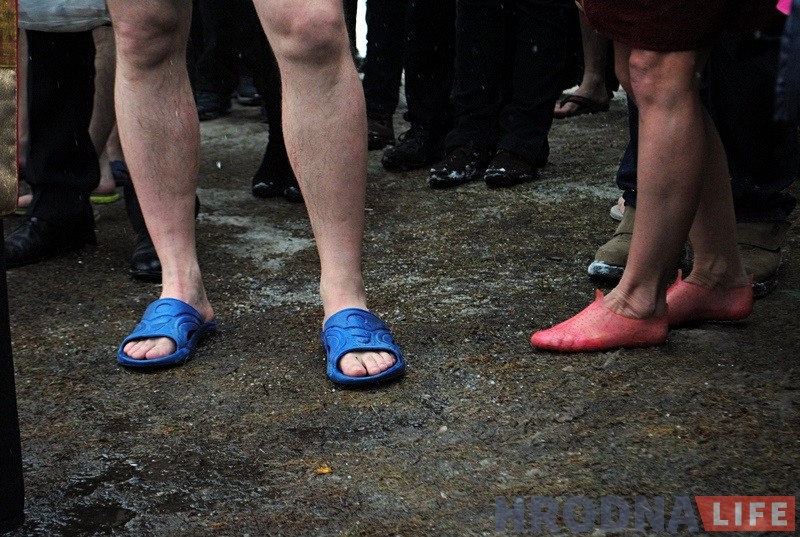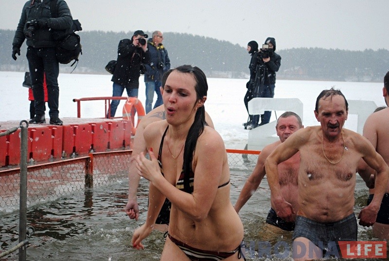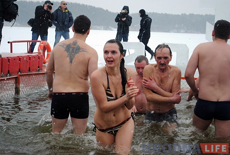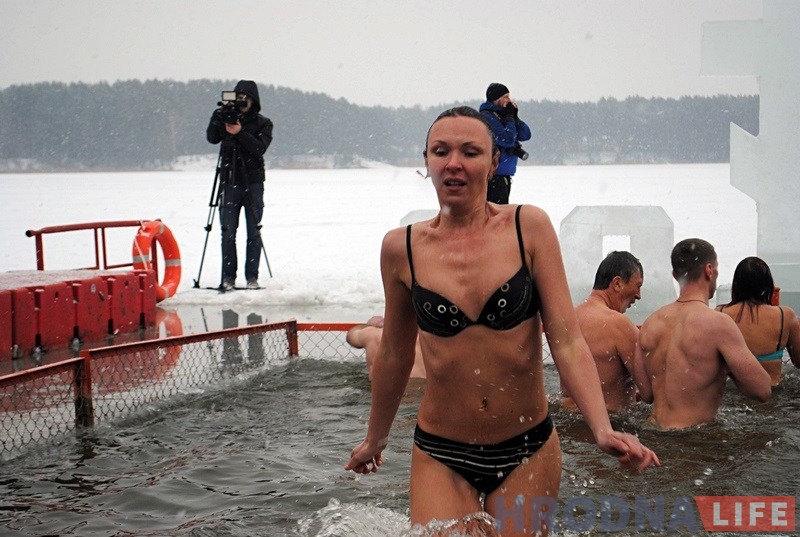 После слов священника и освящения иордани, замерзшие на морозе гродненцы стали окунаться в воду.