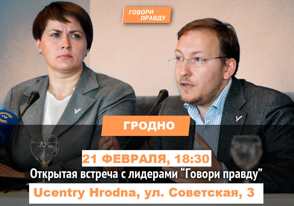 21 февраля в Центре городской жизни (ул. Советская, 3, галерея «Крыга») состоится встреча с руководством компании «Говори правду». К жителям города над Неманом приедут Татьяна Короткевич и Андрей Дмитриев. Они посетят Гродно в рамках поездок по региональных центрах.
