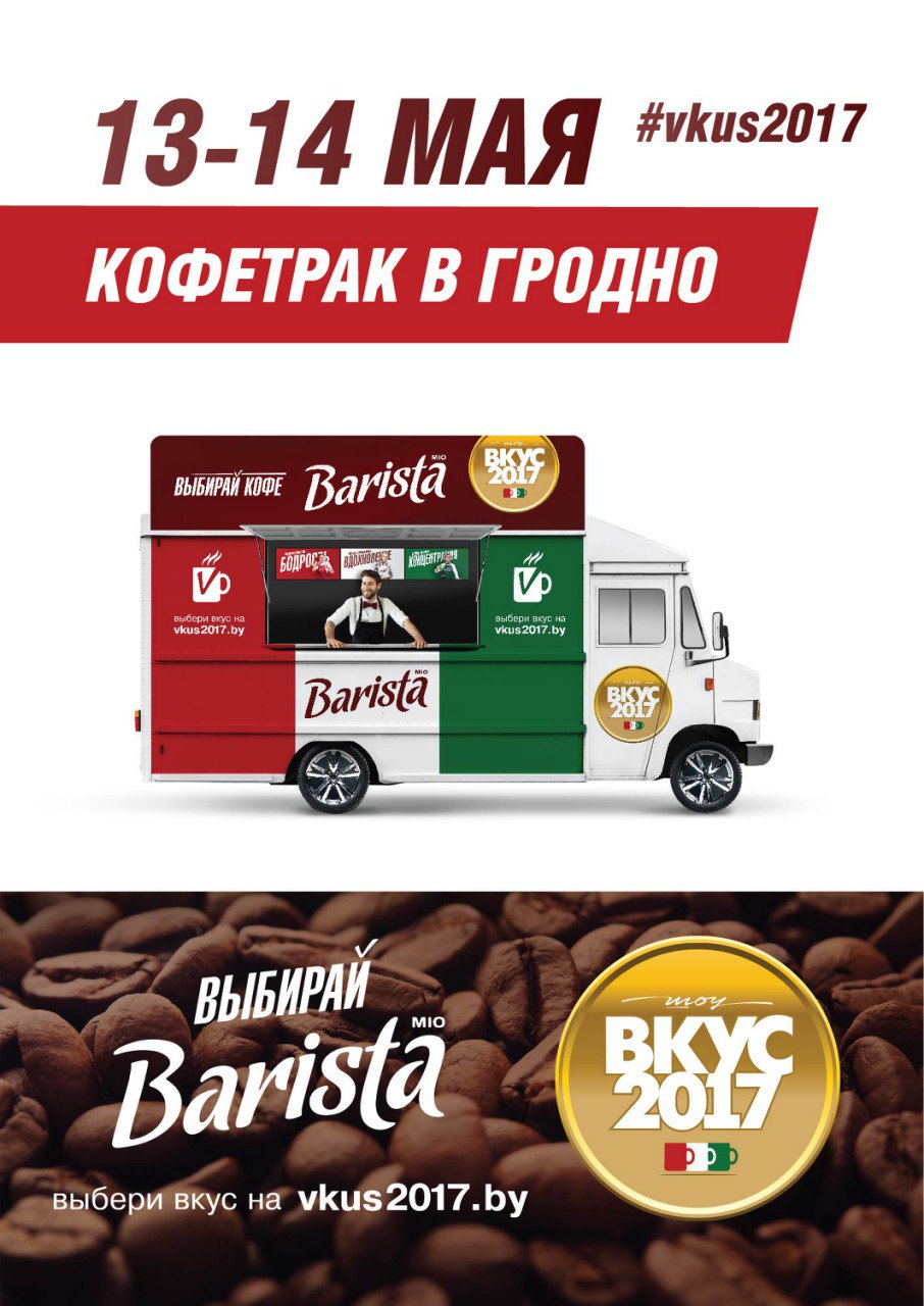 В рамках рекламной кампании кофейного бренда Barista по Беларуси катается их фирменный кофетрак. Кофе раздают в обмен на участие в голосовании — какого состояния от кофе не хватает белорусам: бодрости, концентрации или вдохновения. Каждый из вариантов представляет белорусская звезда. Бодрость — Вадим Галыгин, концентрация — Алесь Мухин, вдохновение — Лариса Грибалёва.