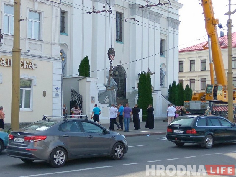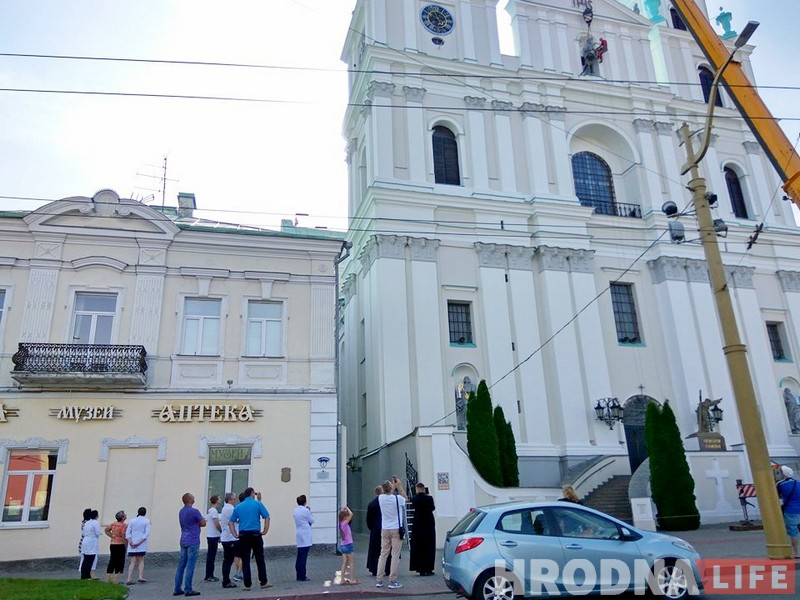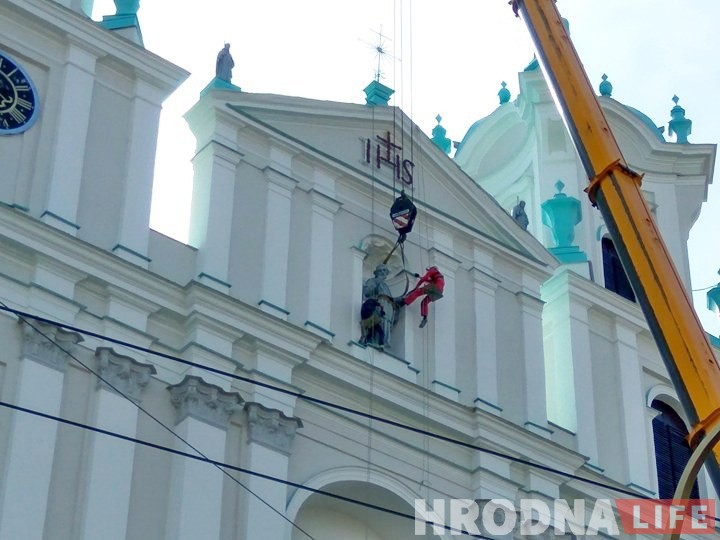 Деревянную скульптуру святого-покровителя гродненского Фарного костела вернули на центральный фасад базилики 11 августа. Фигуру снимали на время ремонта храма для проведения реставрации.