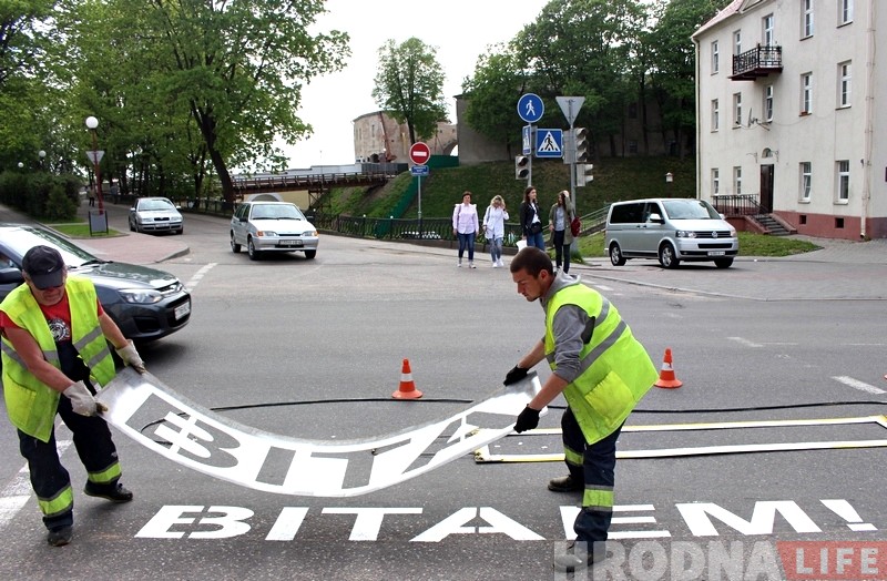 Первая надпись «Вітаем» появился на пешеходном переходе в районе автовокзала в конце апреля. К 9 мая в центре Гродно появится еще 5 таких надписей. Такое нововведение служб пришлось по душе как гродненцом, там и гостям города.