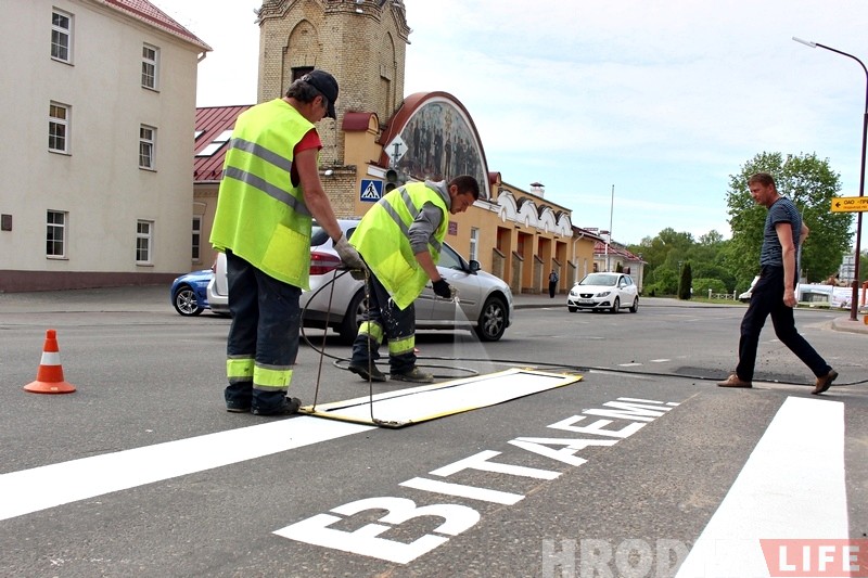 Заказчиком надписей на пешеходных переходах выступила Гродненская ГАИ, оформлением занимаются сотрудники «СМЭП Гродненского облисполкома» (организация, ответственна за нанесение дорожной разметки).