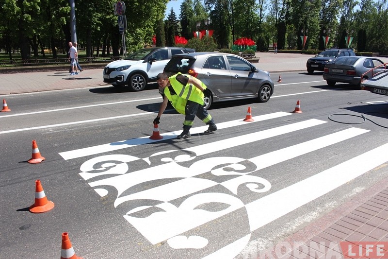 Все началось с надписи «Вітаем», которая появилась на пешеходном переходе в районе автовокзала в конце апреля. В начале мая в центре Гродно появились еще подобные надписи. А с 8 мая сотрудники «СМЭП Гродненского облисполкома» (организация ответственная за нанесение дорожной разметки) вместе со студентами университета имени Купалы начали наносить целые изображения.