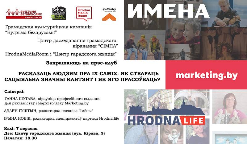 О том, как журналисты создают и продвигают материалы, важные для людей, расскажут на встрече в пресс-клубе, который пройдет в Гродно 7 сентября. Экспертами будут Анна Шутова, руководитель профессионального издания для рекламистов и маркетологов Marketing.by, Адарья Гуштын, редактор журнала «Имена», Ирина Новик, редактор спецпроектов портала Hrodna.life.