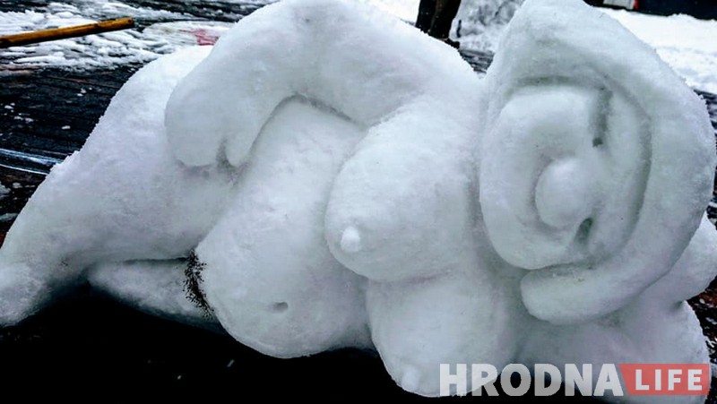 Необычная снежная женщина появилась в Салатье — деревне художников под Гродно. Ее автор — Татьяна Гардашникова из Минска. Летом Татьяна была участницей женского художественного пленэра в этой деревне. Зимними выходными 13-14 января она вспомнила лето и, пользуясь оттепелью, слепила снежную… ну, точно, не бабу, а женщину в стиле «ню».