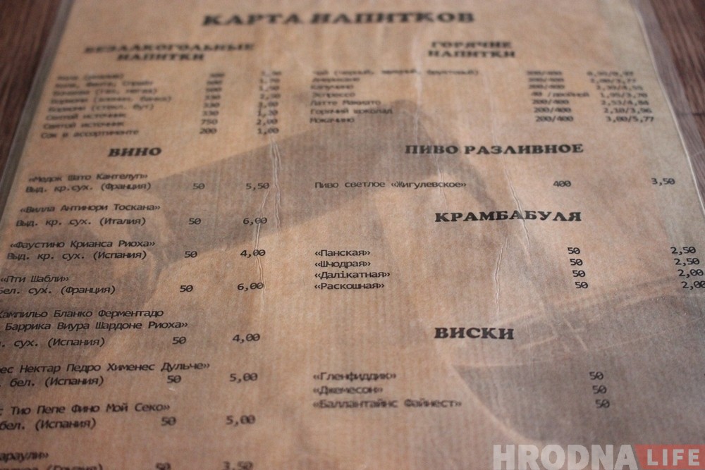 Также в кафе имеется большой выбор различных напитков, в том числе и алкоголя, основным является белорусская крамбамбуля. В будущем в заведении появятся завтраки и новые блюда.