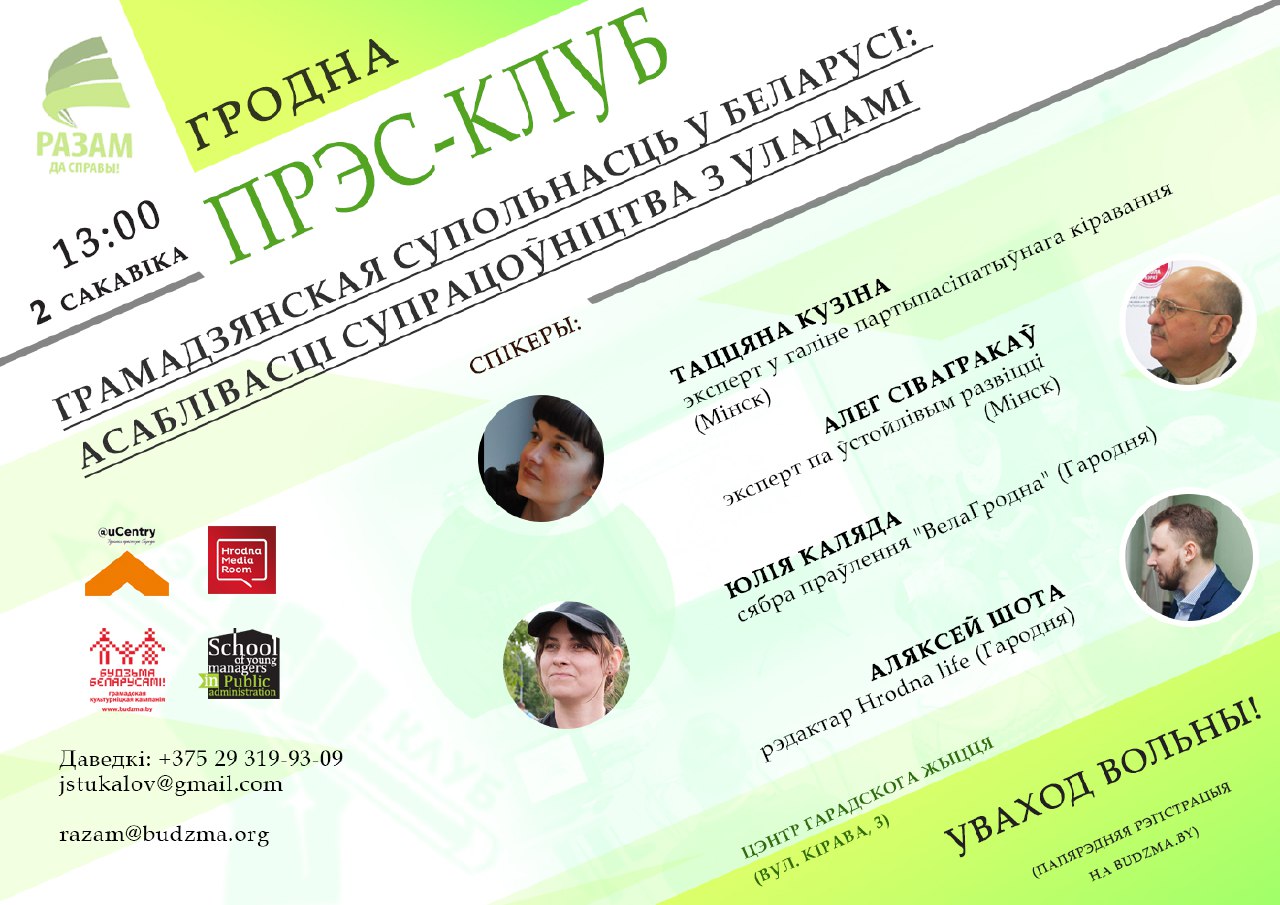 2 марта компания «Будзьма беларусамі!» и Центр исследования общественного управления SYMPA отправляются в Гродно, чтобы на специальном пресс-клубе обсудить взаимодействие общественного сектора и властей в регионе. Встреча состоится в ряде целой серии мероприятий, которые проходят в Витебске, Могилеве, Минске и Бресте в рамках региональной программы «Разам да справы».