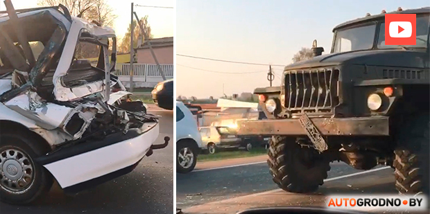 На улице Суворова около 21:00 27 апреля  Урал из военной части врезался в попутный VW Passat B4. Ударом грузовик смял заднюю часть универсала до самой двери и отбросил легковушку на метров 40 вперед. Читатель АвтоГродно поделился видеозаписью, он проезжал мимо этого нетипичного ДТП.