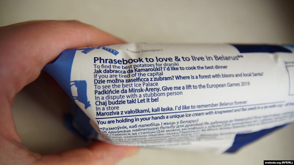 В середине марта в продаже появилось мороженое «Валошка» компании «Белый полюс» — с настоящими цветами василька в составе. Мороженое сделали из расчета на туристов, на обратной стороне этикетки разместили белорусско-английский «словарик», в котором была в том числе фраза «Жыве Беларусь», пишет s**boda.org.