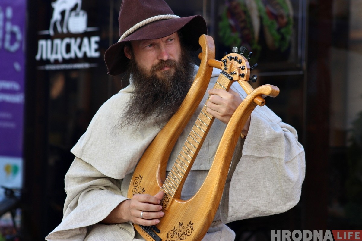 Два года Андрей Гончаренко не играл на Советской. Гродненцам он знаком не только как ремесленник, но и как сказочный путешественник, который играет на флейте. 23 июня он вышел на пешеходную улицу в новом образе и с лирой, которую сам смастерил.