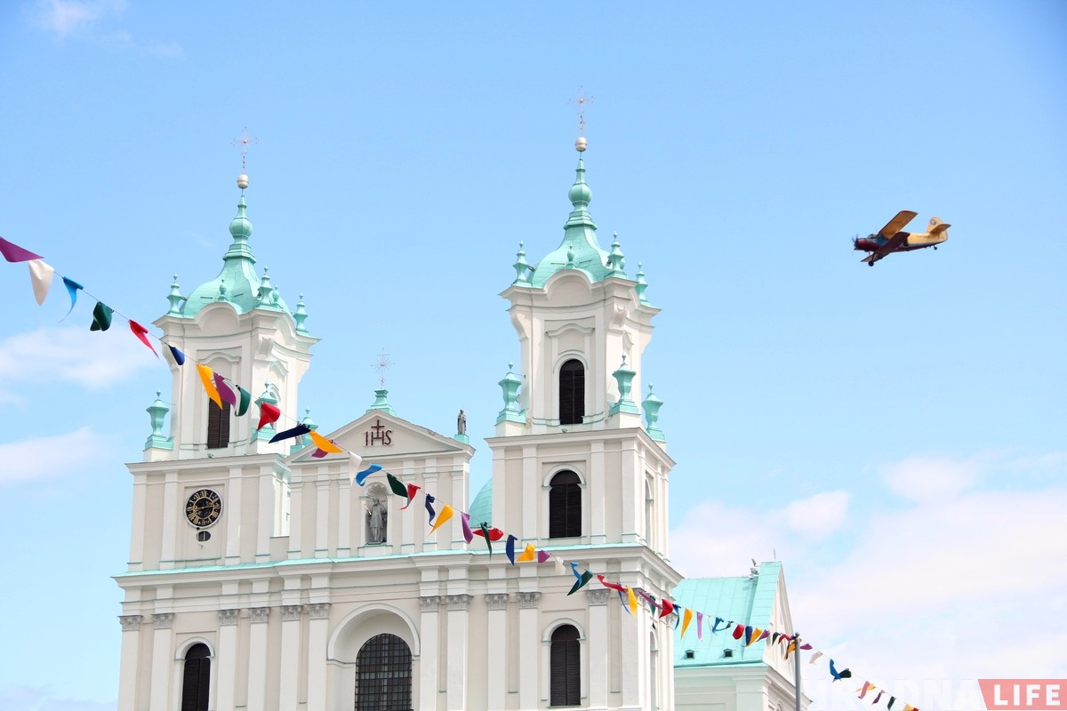Ещё 2 июля в горисполкоме сообщали, что пролет самолета над Гродно в День Независимости состоится. Сначала с него хотели скинуть листовки с поздравлением, потом предлагались и другие варианты. В итоге самолет низко кружил над центром города и ничего не сбрасывал. Так было на Советской площади, где было много людей.
