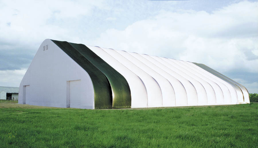 • Арочные тентовые конструкции. Хорошо противостоят ветровым нагрузкам. Используются в животноводстве, создании производственных площадей. Просты в установке, строение легкое и надежное. Ширина 9-18 метров. Длина может быть любой. Тент сварен в цельный полог, есть элементы натяжения и закрепления. Устанавливается сооружение на бетонный фундамент на шпильки.