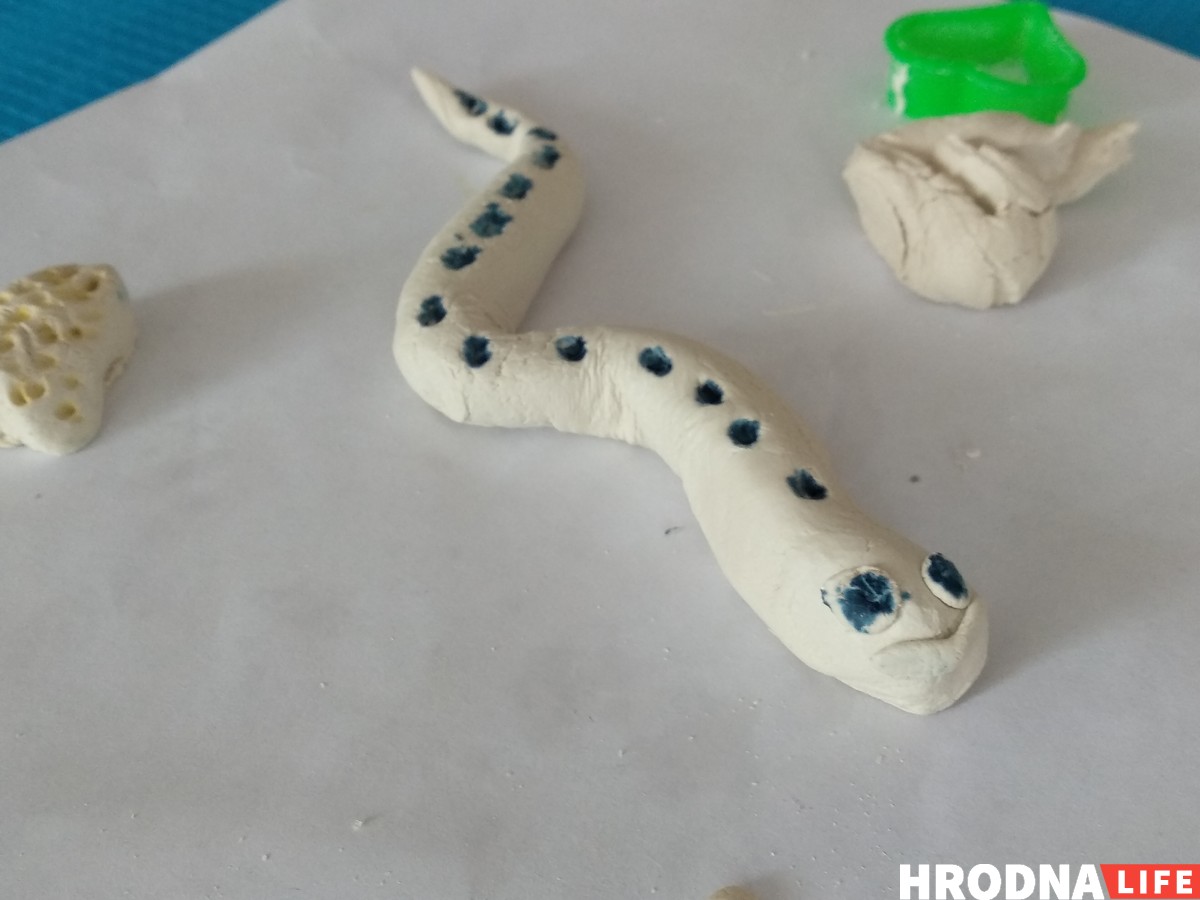 «Видишь, какая толстенькая у тебя лиса, она же не такая. Давай ее немного вытянем…», — белая глина может превратиться во что угодно, но в лису никак. Не беда, зато получился хорёк, ещё волшебная улитка, змея с синими кругами, неведомая птица… «Теперь давай рыбу лепить»… «А что такое рыба?»