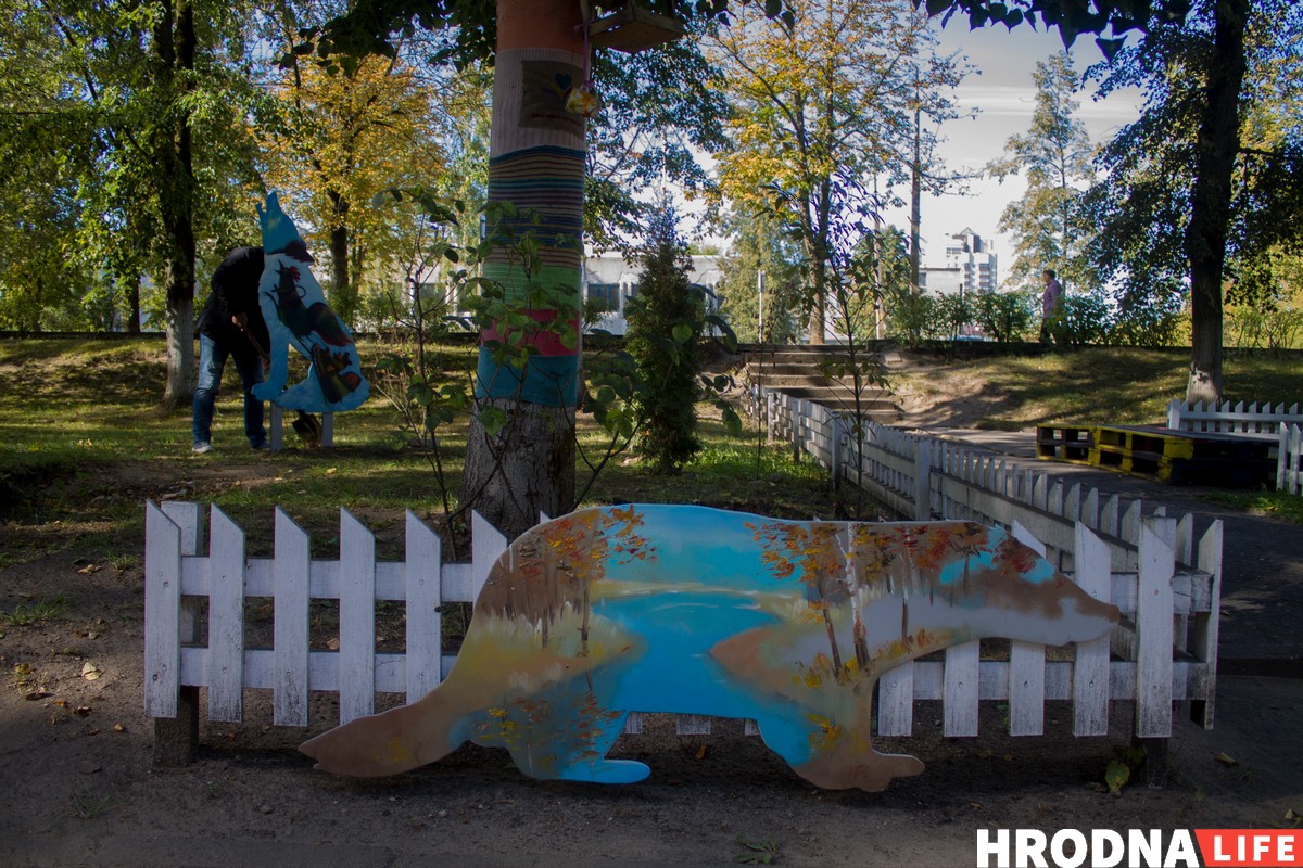 Среди животных — белка, олень, медведь, рысь, барсук, волк и зубр. Вырезать объекты помог Строительный лицей. Художники разобрали объекты и загрунтовали, чтобы уберечь от дождя и снега. И теперь они украшают дворик.