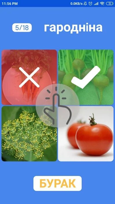 Логика игры проста. Пользователю показывается слово и четыре фотографии, одна из которых соответствует данному слову. Нужно выбрать этот снимок. Слова сформированы по небольшим мини-играм. Например, те что заканчиваются на «А» или у которых есть две «О» и так далее.