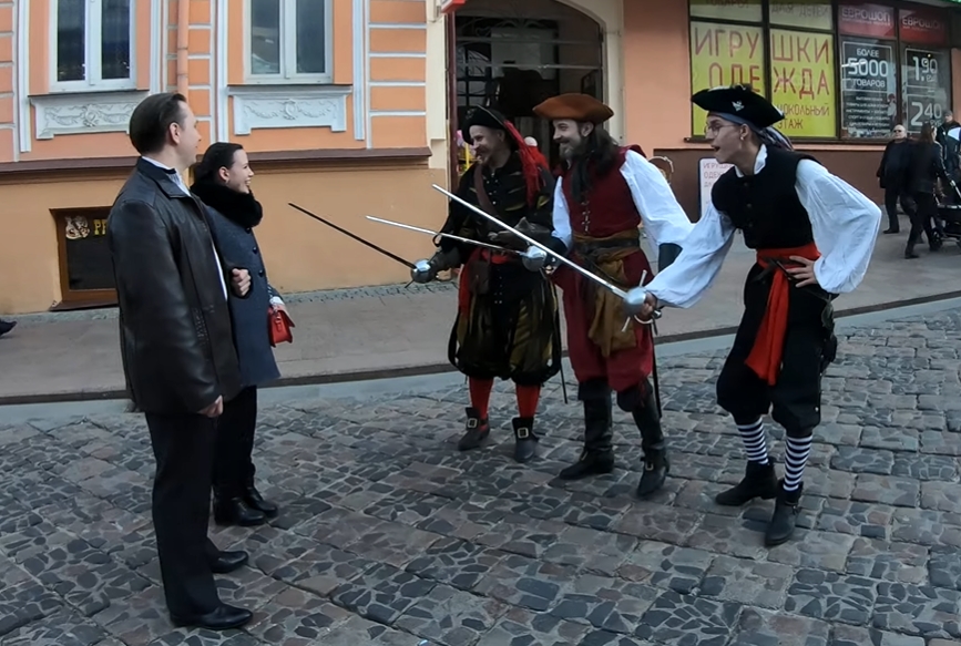 Вечером 25 марта на улице Советской пираты напали на прохожего и забрали его девушку. Мужчине пришлось вступить в бой с тремя злодеями, чтобы освободить возлюбленную и заполучить сундук сокровищ. Такую легенду придумал гродненец Алексей, чтобы сделать предложение своей подруге Маргарите.