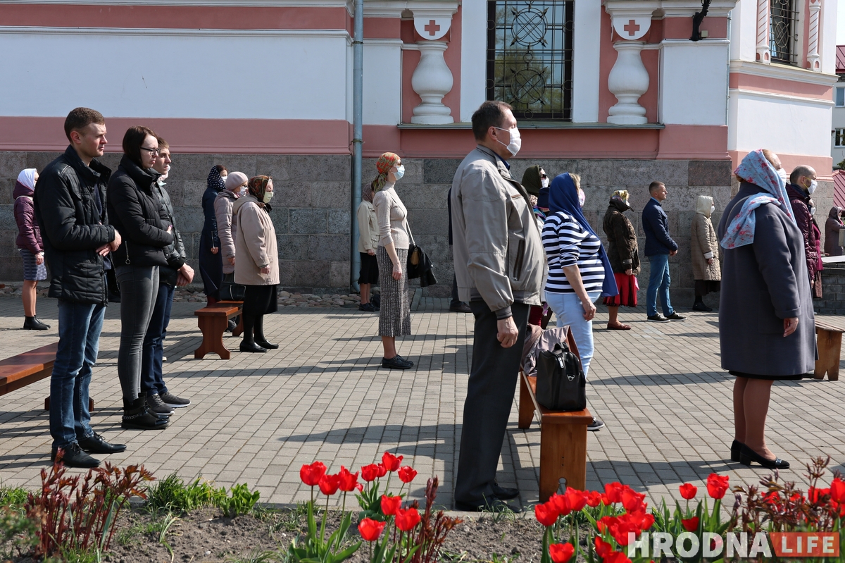 Литургия на Радуницу в Покровском соборе в Гродно впервые прошла на улице. Это связано с эпидемиологической ситуацией в стране. Около 100 верующих пришли на службу.