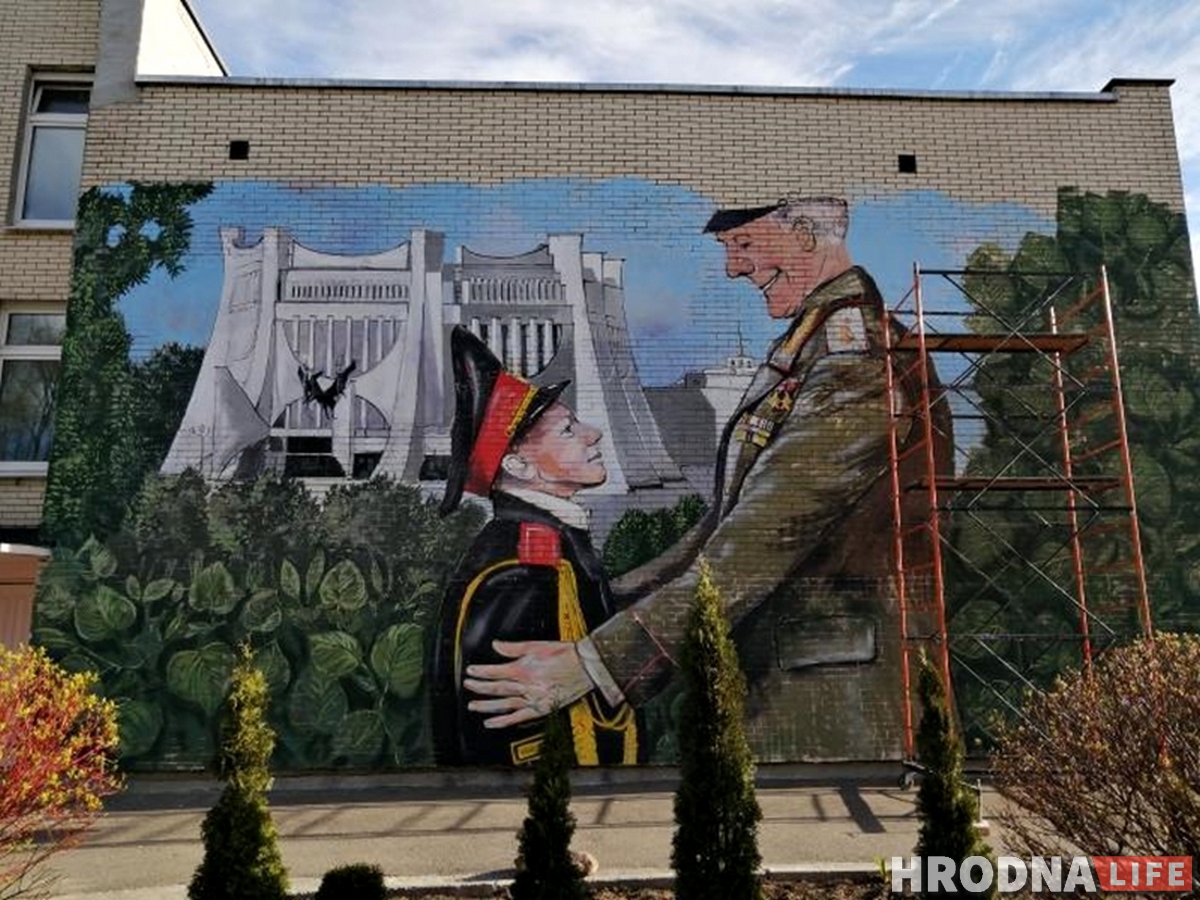 За основу росписи художник брал кадр из советского фильма «Офицеры». В школе №28 есть кадетские классы, поэтому вместо советского суворовца на росписи был изображен кадет с генералом. А чтобы местность была более узнаваемая, художник нарисовал гродненский драмтеатр.
