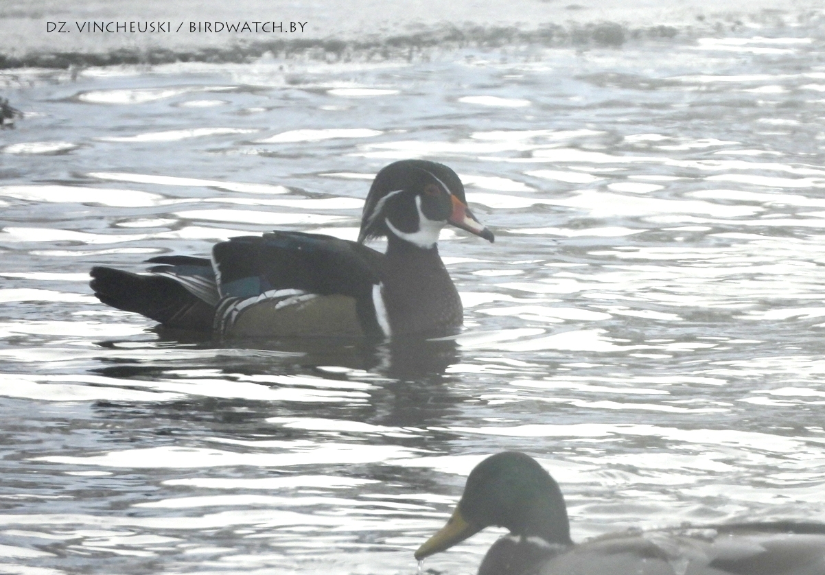 — Чтобы отыскать его, мы переехали через весь город на противоположный от прудов “Азота” берег Нёмана – туда, где напродив в реку сбрасывается очищенная вода и с “Азота”, и с водоканала, и тут и произошли незапланированные сюрпризы! – рассказывает Дмитрий Винчевский. — Среди густого пара, который порывы ветра разносили над водой, Татьяна заметила необычную для нас утку, оказавшуюся самцом каролинки! Он держался немного отдельно от крякв и чирков-свистунков, которые активно кормились у фонтанов.