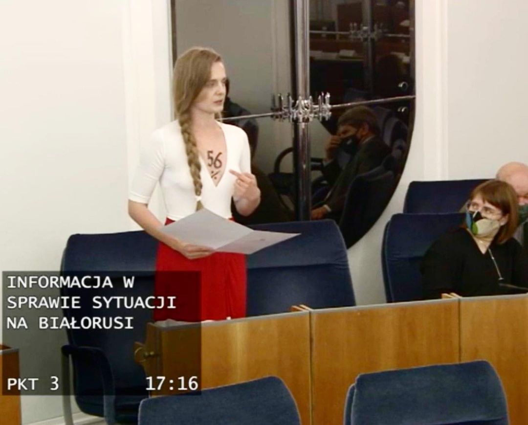 На церемонии награды художница была в платье, сделанном из портретов 1200 политзаключенных в Беларуси. Во время вручения премии она зачитала свое открытое письмо к семьям политзаключенных. В нем она поблагодарила за воспитание несгибаемых людей, вспомнила все трудности, с которыми сталкиваются семьи узников и рассказала о способах поддержки и реабилитации для политзаключенных после освобождения. Выступление она закончила «минутой крика для Беларуси», к которой присоединился зал.