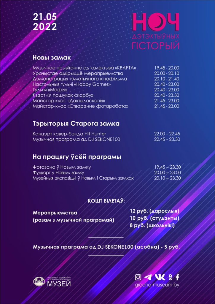 На территории Лидского замка 21 мая организуют программу “Живая история” от клубов исторической реконструкции “Шотландский клан МакВитан” и “Веруш”, а также концерт средневековой группы “Скудринка”. Организаторы обещают, что у входа в замок посетителей будут встречать артисты-ходулисты театра “Ergo Bibamus”, которые пообщаются, станцуют и пожмут всем руки.