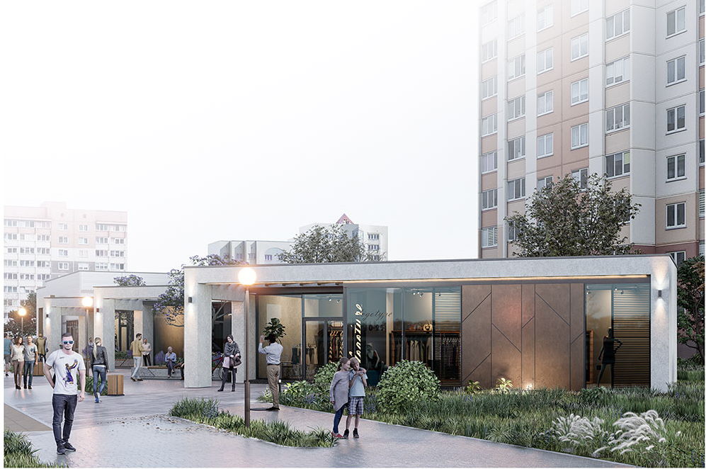 Комплекс нового торгового центра появится рядом с существующим магазином «Грошык» на Богушевича, 40. Здания будут выполнены в стиле минимализма: цемент, много стекла, керамогранит. Если верить проекту, пространство рядом собираются озеленить, установить лавочки. Также проект предусматривает создание безбарьерной среды.